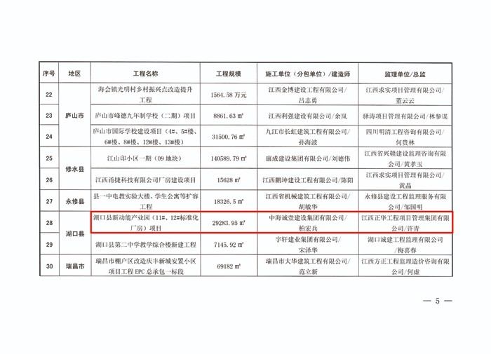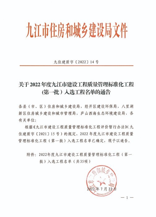 近日,九江市住房和城乡建设局公布了《关于2022年度九江市建设工程质量管理标准化工程(第一批)入选工程名单的通告》,我公司承建湖口县《新动能产业园》项目获评九江市“2022年度建设工程质量管理标准化工程”!